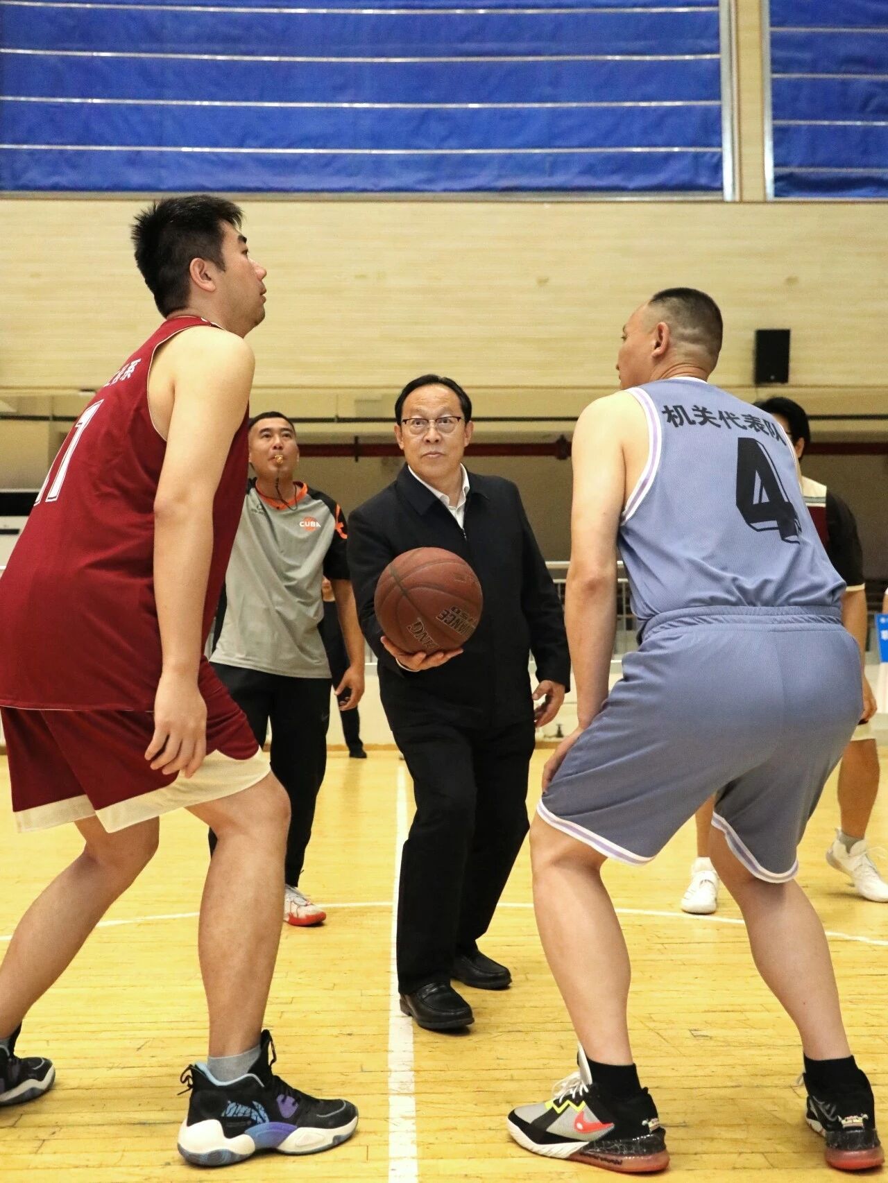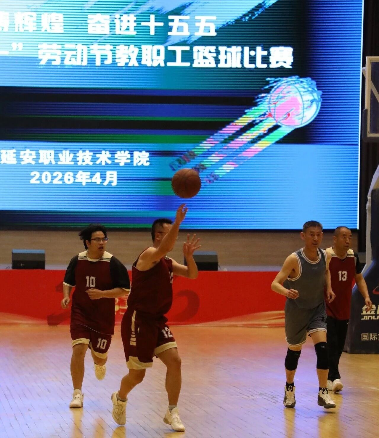 为热烈庆祝“五·一”国际劳动节,弘扬劳动精神,凝聚奋进力量,助力学院“十五五”规划开好局、起好步,4月15日下午,延安职业技术学院庆祝“五·一”国际劳动节教职工篮球赛在大学生活动中心开幕。学院党委副书记、院长牛永红宣布比赛开幕并为首场比赛开球。党委副书记党云萍,党委副书记、纪委书记刘晓霞,党委委员、副院长白国礼、杜善保、陈旭,党委委员、宣传部部长、党政办公室主任惠立彦,相关处室、各系(院)负责人与全体裁判员和运动员齐聚现场,共同见证这场兼具竞技性与凝聚力的体育盛宴。党委委员、副院长姬凌宇致开幕辞。党委委员、工会主席周景毅主持。