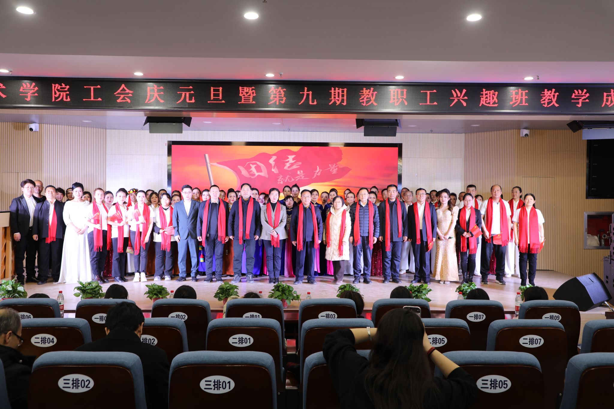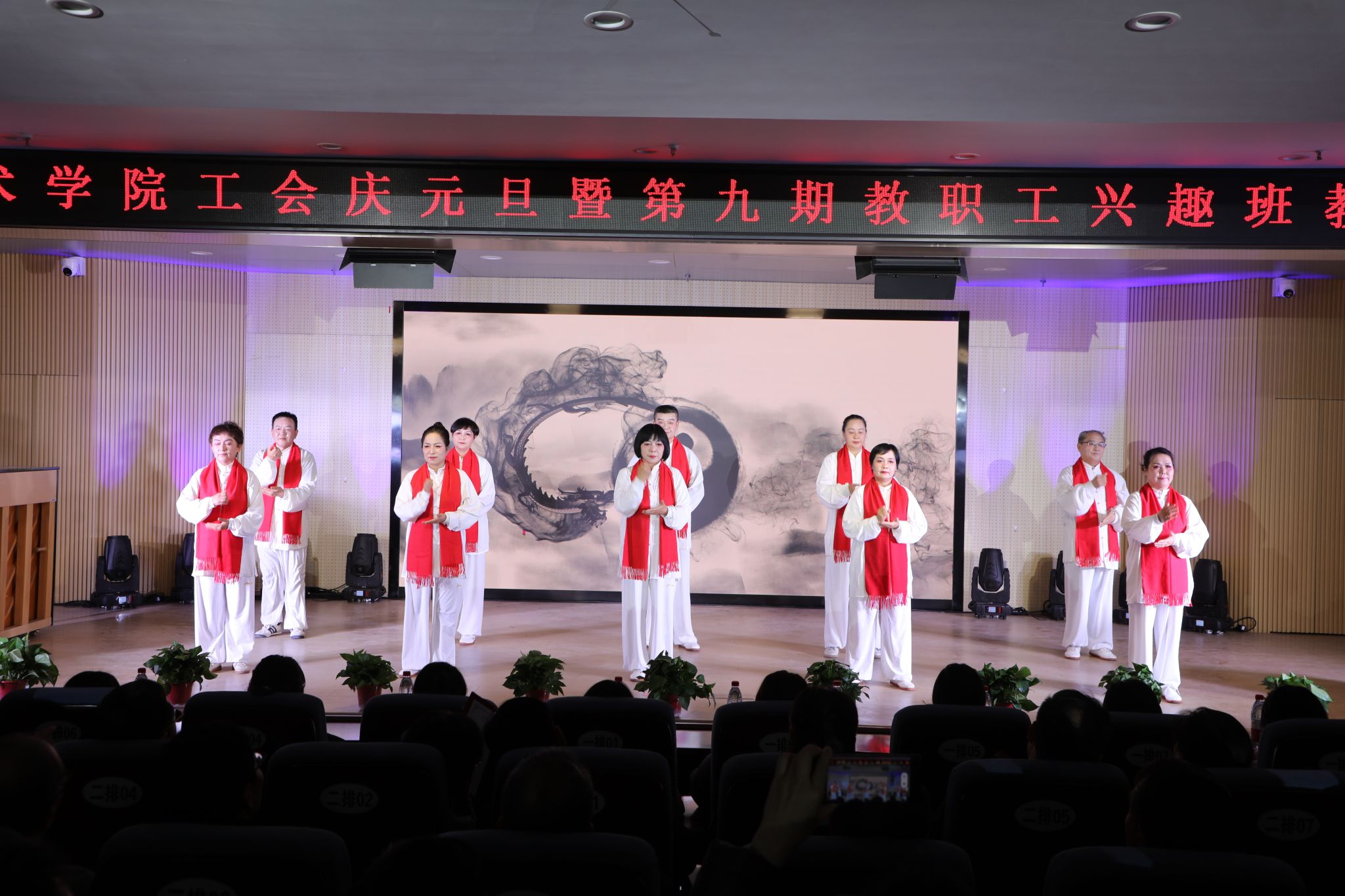 踏歌起舞辞旧岁,欢声笑语迎新年。在动感的旋律下,老师们用活力四射舞蹈《舞动新时代》拉开了晚会帷幕,点燃了现场观众的激情,表达了对即将到来新年的美好期盼。晚会上老师们激情洋溢,节目精彩纷呈,太极班《三十二式太极》刚柔并济,行云流水;歌曲《明天会更好》表达了对伟大的祖国的美好祝愿;古琴班老师合奏《半山听雨》,书法班老师挥毫泼墨;锅庄舞队演出让大家感受到浓郁的民族风情,古筝合奏《荷塘月色》让大家沉浸在美妙旋律中;歌曲《领航新时代》带来别样的感动,非洲鼓合奏《梦想家》让大家感受异域的热情与活力;绘画《希望的田野》展示让大家领略田园风光,二胡合奏《我的祖国》让大家感受深情与豪迈;合唱团演唱的《清晨,我们踏上小道》《娘子军连歌》振奋人心。 最后,学院领导与全体演职人员一起合唱《团结就是力量》,在激昂的歌声中落下展演活动帷幕。(审核、撰稿丨齐珺琰,责任编辑丨张旭静,实习编辑丨杨童童)